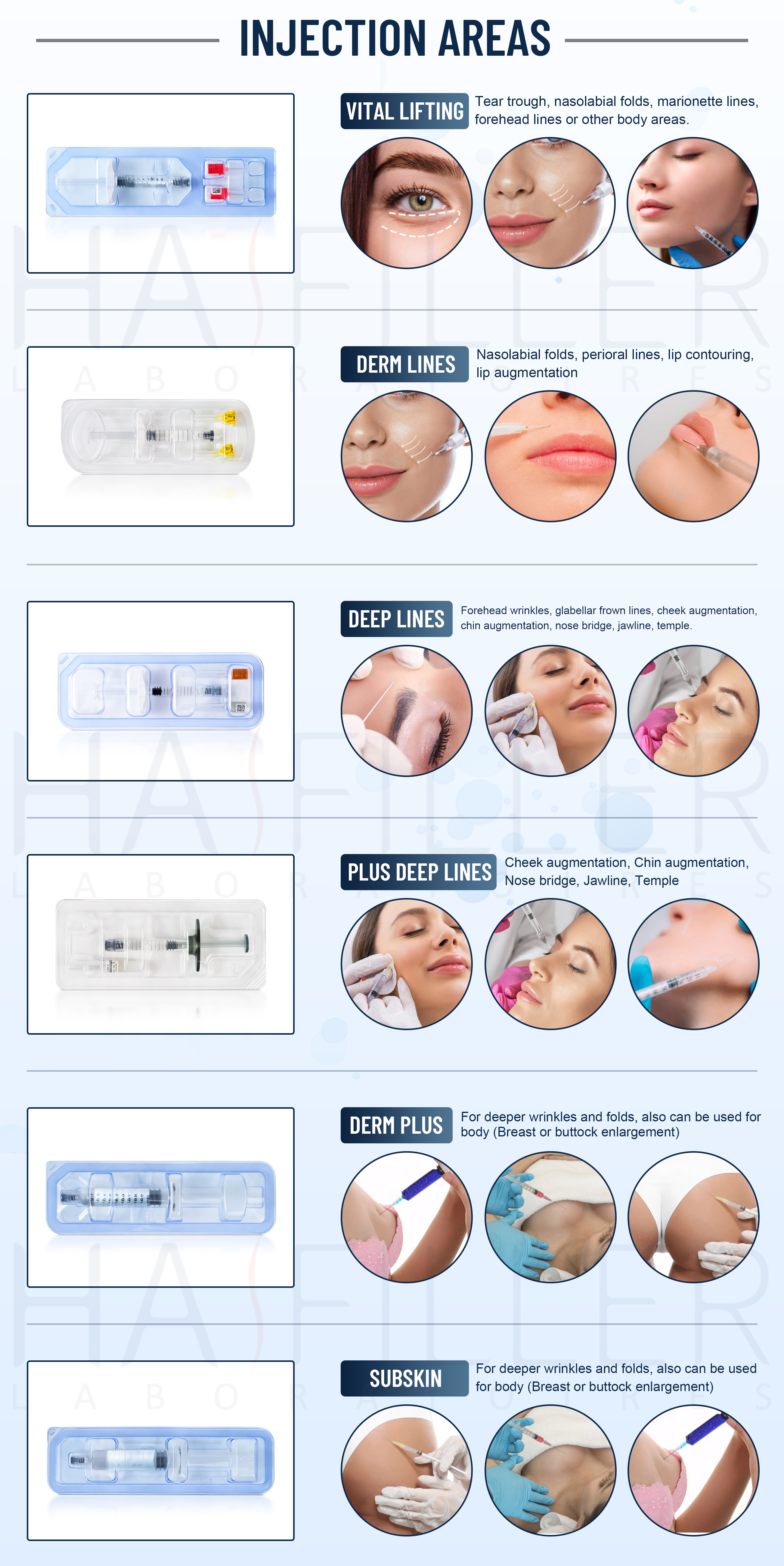 It can be used for forehead wrinkles, Glabellar frown lines, Nose bridge, Chin augmentation, Cheek augmentation, Jawline, Temple.