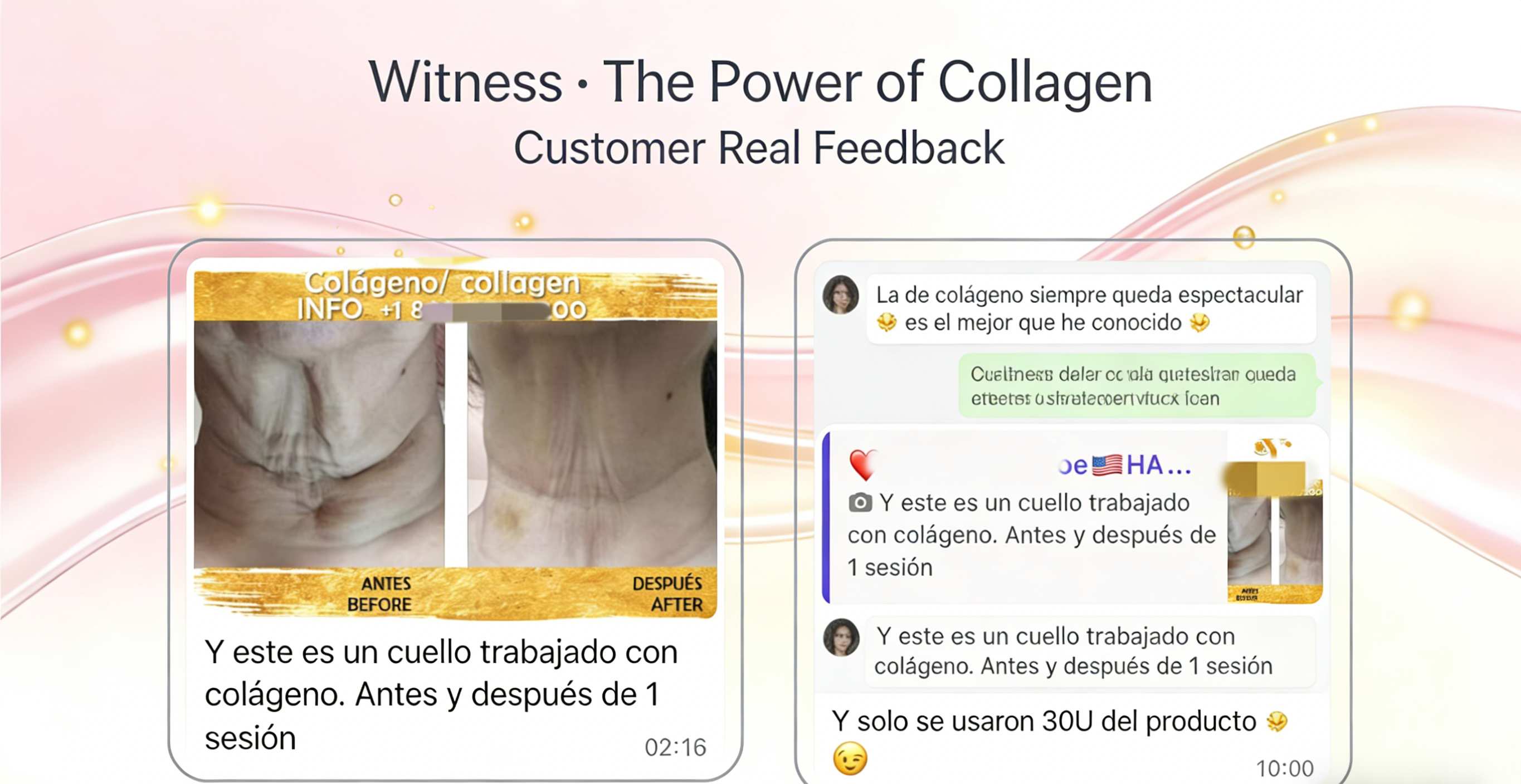 After just one treatment with OTESALY Collagen Lift Solution, she was amazed: "Y este es un cuello trabajado con colágeno... Y solo se usaron 30U" (And this is a neck treated with collagen... and only 30U was used).
